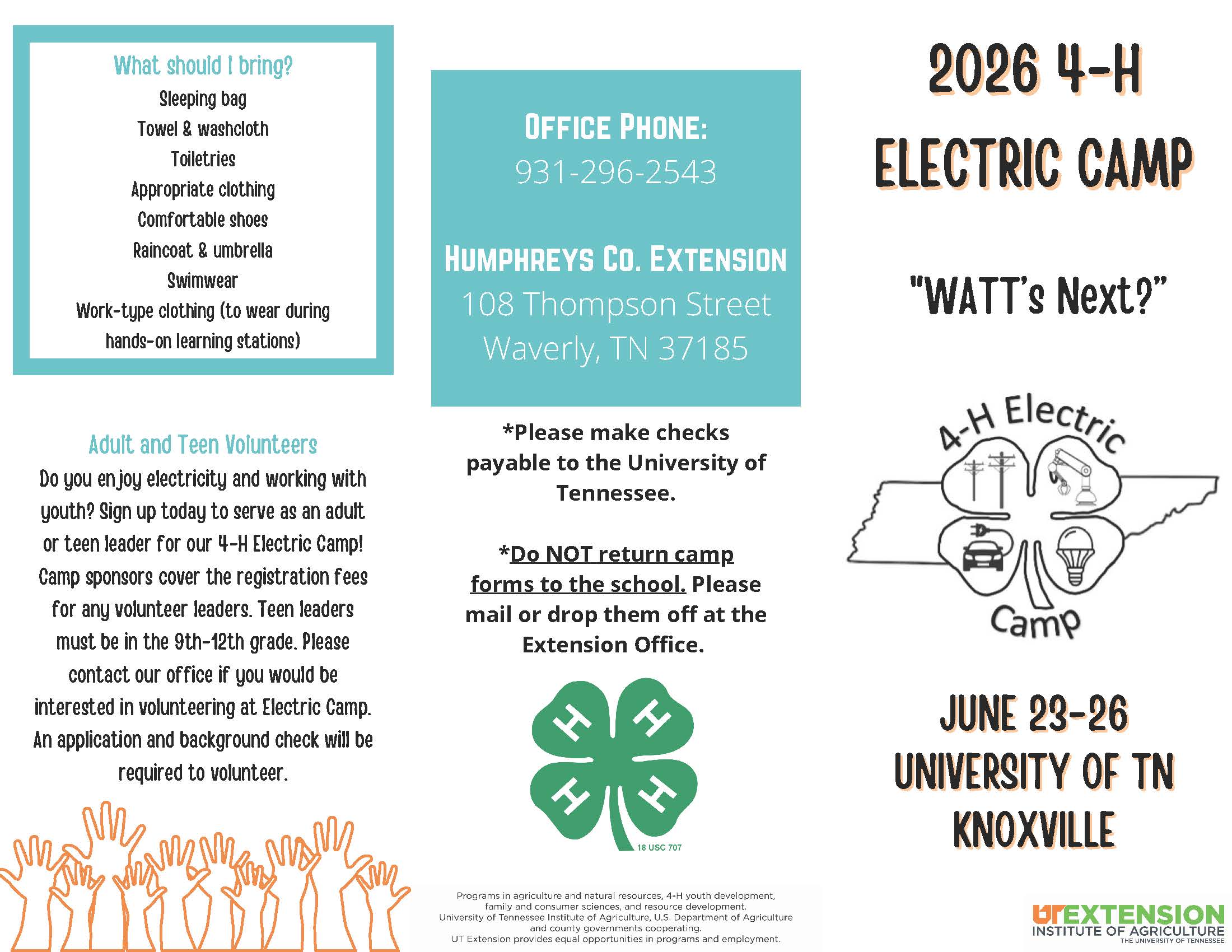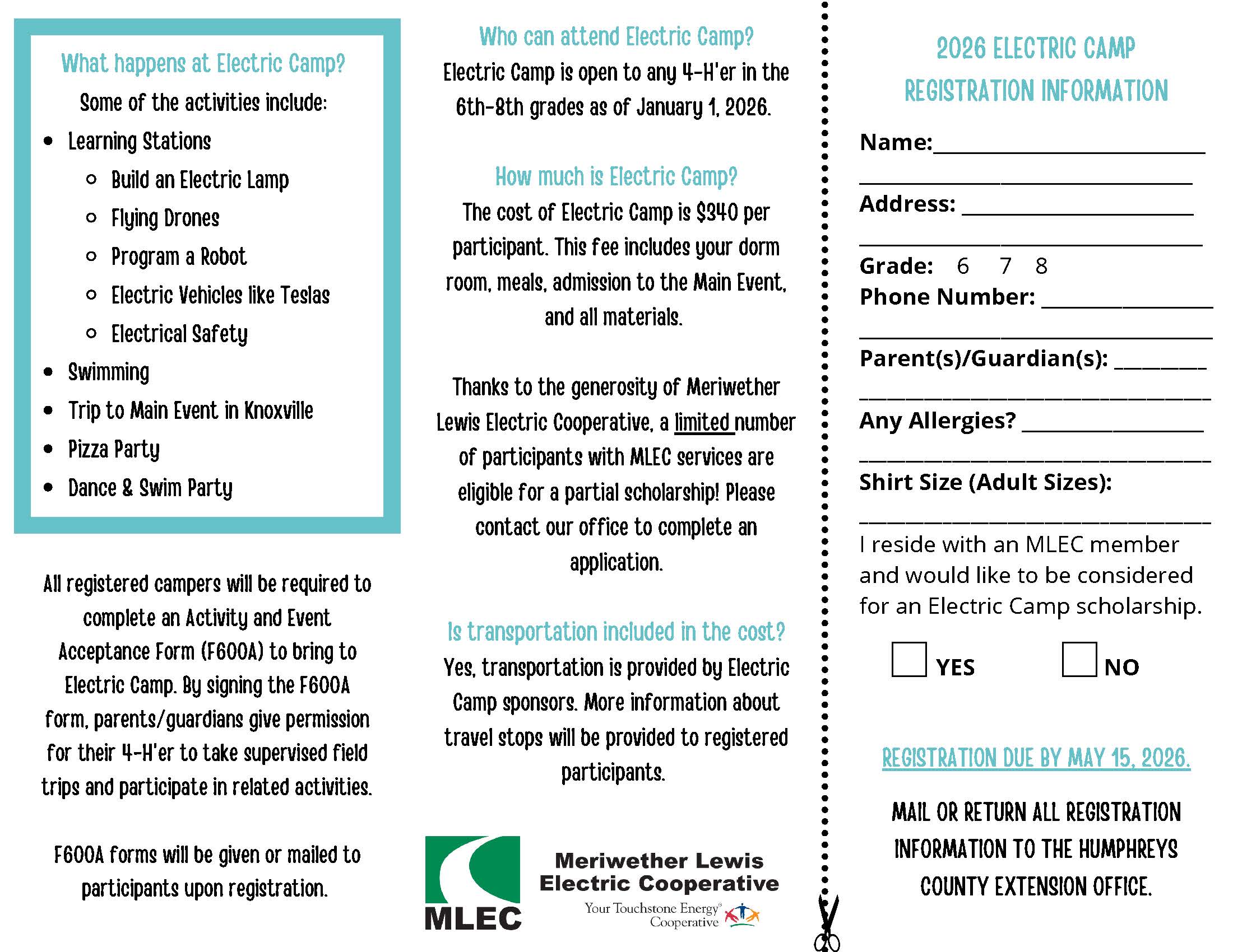 4-H Electric Camp is a fun-filled, rewarding adventure in electricity. At camp, you will learn what electricity is and how it works. You will work with electrical specialists from across the state in learning centers. Each learning center will consist of hands-on activities so that you can learn by doing, including robotics, energy conservation, electric vehicles and last but not least, blowing up stuff! You will also have the chance to meet other 4-H’ers from across Tennessee and explore careers in energy, electricity and basic sciences. Each camper will receive a certificate, a T-shirt and items that you have made at camp. It’s really an electrifying experience!