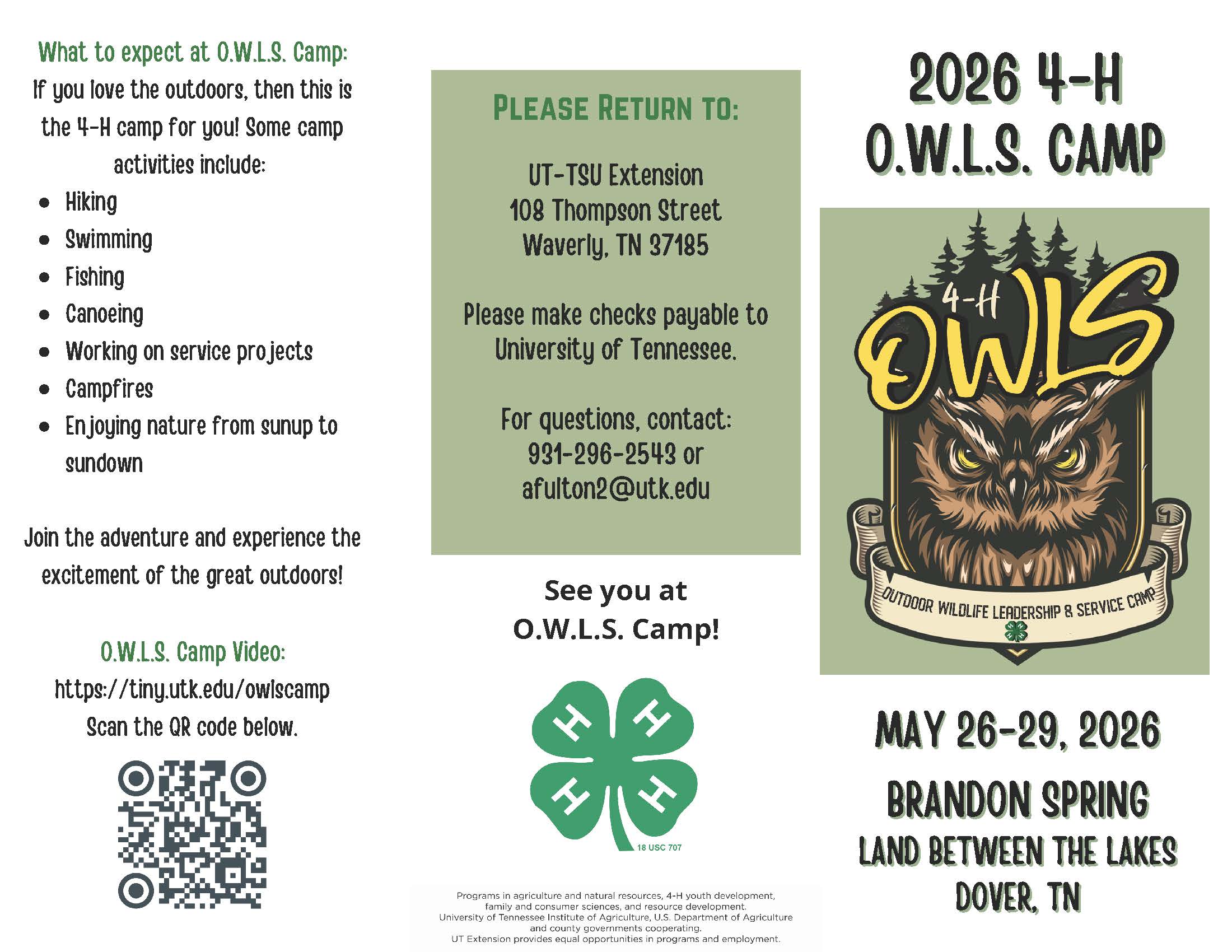 4-H O.W.L.S. (Outdoor, Wildlife, Leadership, Service) camp is held at Brandon Springs at Land Between The Lakes in Dover. 4-H’ers will enjoy outdoor activities such as hiking, swimming, fishing, canoeing, campfires, enjoying nature and doing service projects.